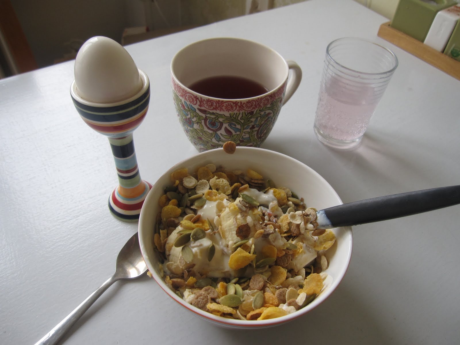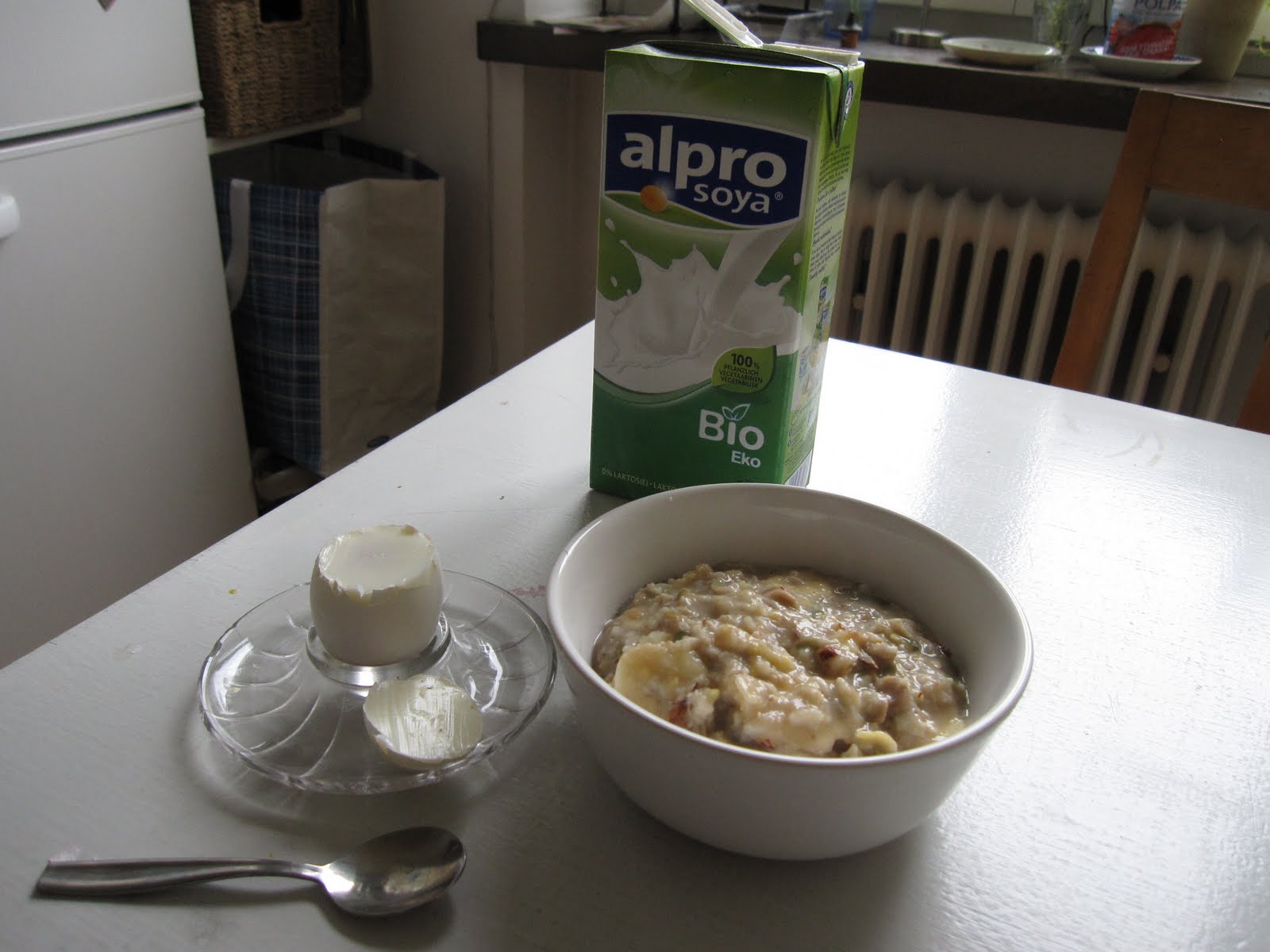 Jag har nog aldrig ätit så mycket banan som jag göra nu, blir minst 2 per dag! och de senaste dagarna har det blivit mycket ägg. Hade kokat ägg för att ta med mig till jobbets frukostmöte de har onsdagar, men glömde dessa hemma och blev serverad ägg där! De jag glömt hemma åt jag upp med spenatsoppan igår och till frukost i morse. Sen så var det som "scrambled eggs" röra jag blev serverad till lunch! Ägg är verkligen gott men skulle visst ätas med måtta helst max 3-4 gånger i veckan. Min frukostgröt med bananen i en stund och hasselnötter blev mycket god! Toppade det hela med kanel!